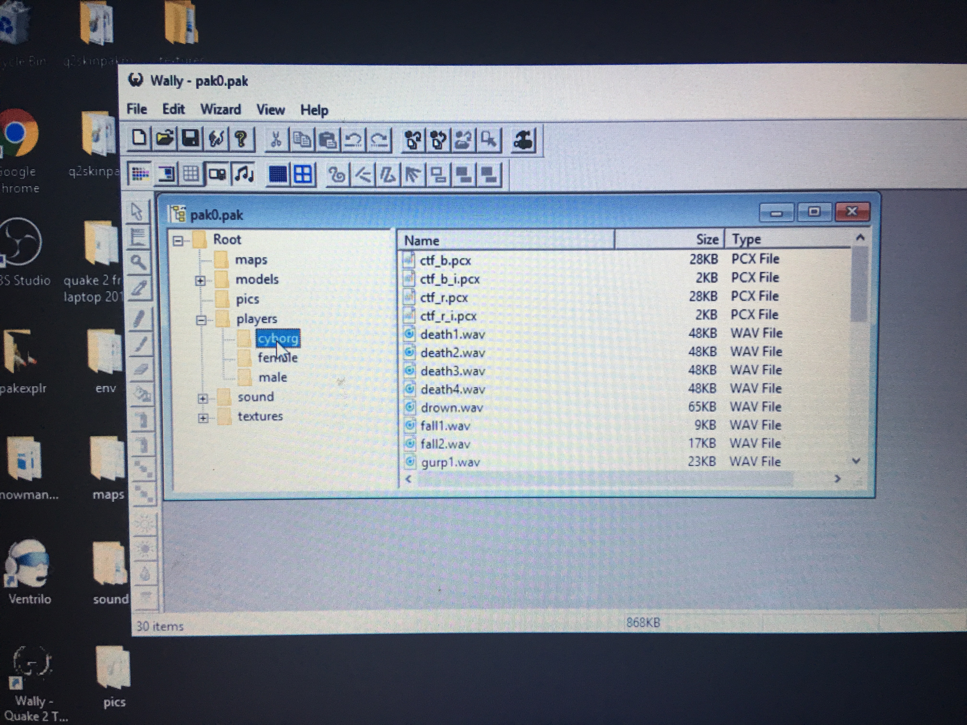 That’s the first half of changing: getting those folders to where they have only the files for the PPM you’re using. The next half is to do the same thing INSIDE the pak0.pak file in your c:/quake2/ctf/ folder. To do this you will need the .pak file editing software of your choice, I recommend Wally. Here is a link to Wally: