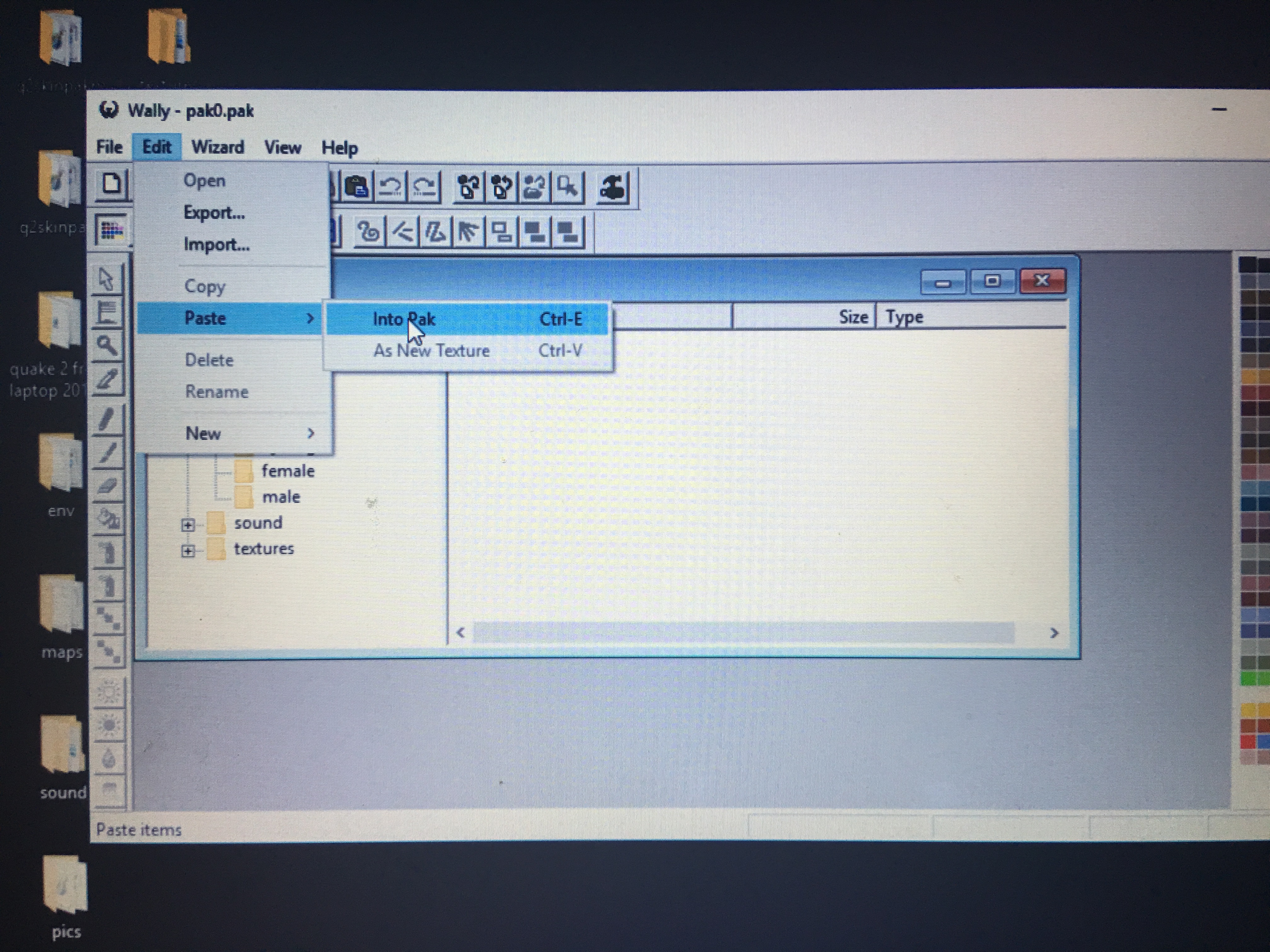 Once you have opened the pak0.pak file inside the folder c:/quake2/ctf/ navigate inside the folder tree to players, and then you will see “male”, “female” and “cyborg” subfolders. You will need to select all the files in each folder, and delete them. And then click inside the empty space where they were, and go to Edit, and Paste, Paste Into Folder. And that way copy all the files of the PPM into those 3 folders.