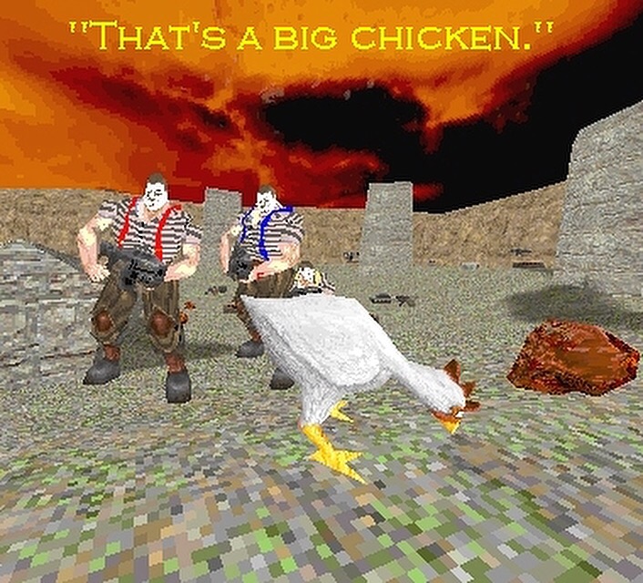 Holy squawking chicken, gib man. Call it Rabbit, wacky Chicken style. One person grabs el pollo peligroso, which makes that player lose all weapons, but they gain points for ever second they stay alive. Meanwhile, everyone else is chasing the chicken-carrier, guns ablazin’. One file fits all.