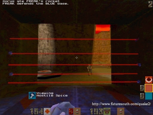 Hand grenades are replaced by laser trip mines. To use one, throw a hand grenade at any surface. The grenade will stick to the first surface it comes in contact with, and will begin to emit a laser perpendicular to that surface. The laser itself acts only as a tripwire and does no damage. The laser is the same color as the team you are on. Your own teammates can also trip your mines, but do not take any damage. After 60 seconds, mines power down and explode. Defense can actually be fun now! We have taken care to place grenade packs on maps so as to not overwhelm maps with lasermines or cause it to be impossible to get into a base. #quake2 #q2ctf #lasermine #laserwall #laserbeams #frikkinlasers