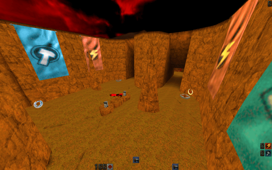 Here is Rocky I by Azrael. This map is significant because the ground is textured organically, similar to Caco, and promotes fun and fast grappling. In fact, the map makers behind Caco, Myrkul and Publius, recommended this map for their ExpertCTF mod for this very reason.