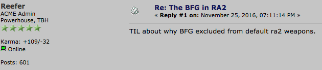 First of all, the gun is available to all of the players. Anything that is given on purpose by game makers to all players and in public knowledge should not be considered cheating (I hold this view on the FOV issue as well). If you think the BFG is unbalanced and superior to all other weapons then use it! No one ever criticized a Rocket Arena 1 player for using the Rocket Launcher–even though it was far superior to all of the other weapons. If you think you are too GOOD to use the BFG, then don’t, but don’t complain when others choose to.