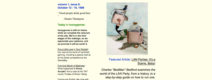 Credits: Illustration © 1998 Mike Sanzone. LAN Parties: It’s a Scene, Baby! is © 1998 Charles Bedford. All other content is © 1998 loonyboi productions. Unauthorized reproduction is strictly prohibited, so don’t do it…we’ll find you at a LAN party and woop yer sorry butt.