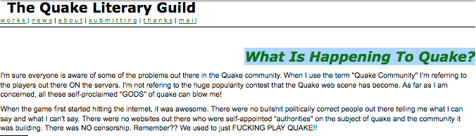 When the game first started hitting the internet, it was awesome. There were no bullshit politically correct people out there telling me what I can say and what I can’t say. There were no websites out there who were self-appointed “authorities” on the subject of quake and the community it was building. There was NO censorship. Remember?? We used to just FUCKING PLAY QUAKE!!
