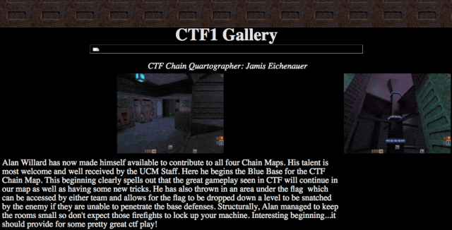 | Alan Willard has now made himself available to contribute to all four Chain Maps. His talent is most welcome and well received by the UCM Staff. Here he begins the Blue Base for the CTF Chain Map. This beginning clearly spells out that the great gameplay seen in CTF will continue in our map as well as having some new tricks. He has also thrown in an area under the flag which can be accessed by either team and allows for the flag to be dropped down a level to be snatched by the enemy if they are unable to penetrate the base defenses. Structurally, Alan managed to keep the rooms small so don’t expect those firefights to lock up your machine. Interesting beginning…it should provide for some pretty great ctf play!Del |