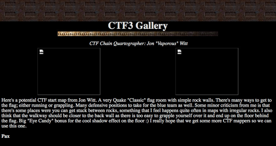 Here’s a potential CTF start map from Jon Witt. A very Quake “Classic” flag room with simple rock walls. There’s many ways to get to the flag; either running or grappling. Many defensive positions to take for the blue team as well. Some minor criticism from me is that there’s some places were you can get stuck between rocks, something that I feel happens quite often in maps with irregular rocks. I also think that the walkway should be closer to the back wall as there is too easy to grapple yourself over it and end up on the floor behind the flag. Big “Eye Candy” bonus for the cool shadow effect on the floor :) I really hope that we get some more CTF mappers so we can use this one.