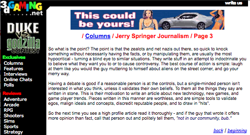 Sure, the news groups are a jungle of spirited rhetoric and bullshit, and we all learn after perusing them that the subject matter should be taken with a grain of salt in most cases. But the most subtle game happens when the supposed informed journalist applies a “Jerry Springer mentality” to an article. When a journalist resorts to shock value to make a point it’s enough to turn a rat’s stomach. The most shocking thing someone can ever do is twist the truth to suit ones’ own purpose. Game Magazines and online publications are proving that opinion and speculation are more important than the actual truth of the matter. The problem is that if an overly opinionated article is taken to heart by the uniformed reader, it can prove to be a vehicle to incite angst towards the subject matter – whether it be a game, a developer, a company, or a person. If you have ever read the newsgroups (my condolences to you for having to endure them) you can occasionally see someone bantering over an article that pissed them off or gave them inspiration.
