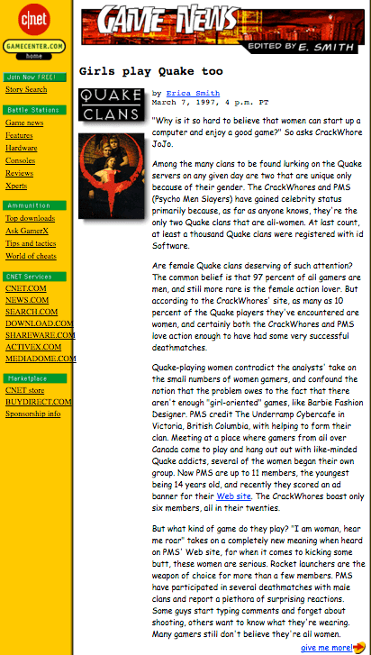 Are female Quake clans deserving of such attention? The common belief is that 97 percent of all gamers are men, and still more rare is the female action lover. But according to the CrackWhores’ site, as many as 10 percent of the Quake players they’ve encountered are women, and certainly both the CrackWhores and PMS love action enough to have had some very successful deathmatches.