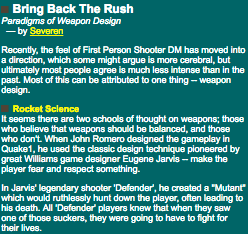It seems there are two schools of thought on weapons; those who believe that weapons should be balanced, and those who don’t. When John Romero designed the gameplay in Quake1, he used the classic design technique pioneered by great Williams game designer Eugene Jarvis — make the player fear and respect something.