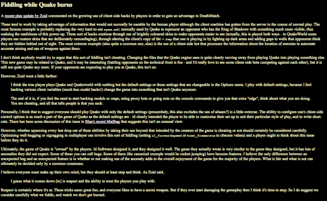 I don’t think anybody would try to argue that this sort of fiddling isn’t cheating. Changing the files that the Quake engine uses is quite clearly moving away from playing Quake into playing something else. This new game may be related to Quake, and it may be interesting (battling opponents on the technical front is fun – and I’d really love to see some client-side bots competing against each other), but it is still not quite Quake any more. If your opponents are expecting to play you at Quake, this isn’t on.
