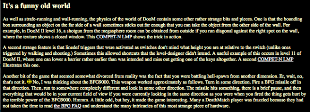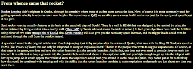 A question I raised in the original article was: if rocket-jumping took id by surprise after the release of Quake, what was with the Ring Of Shadows secret in E4M4 (The Palace Of Hate) that can only be teleported to using an explosive boost? Thanks to the people who wrote to suggest explanations. Of course, at that stage in the game, one does not have the rocket-launcher, just the grenade-launcher. And in fact, one does not even need to grenade-jump to reach the teleport. It is sufficient to drop a grenade into the provided hole and stand above it: the explosion will push you high enough to get up into the teleport with having to jump. So it would appear that whilst id knew that explosions could push you around in useful ways in Quake, they hadn’t got as far as thinking how this could be combined with jumping and with the ability that the rocket-launcher provides to make explosions underneath you just about any time you want them.