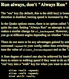 In the Quake options menu, there is an option called “Always Run”. Intuitively one might expect activating this option to have the same effect as always holding down the “run” key: in fact, this is not quite the case. Setting “Always Run” on attempts to simulate the most noticeable feature of running by doubling the value of the console variable cl_forwardspeed from its default of 200 to 400, and makes a similar change for cl_backspeed. However, strafing speed, turning and acceleration do not appear to be affected. You can check this out by going forward and strafing simultaneously: you’ll see you go at different angles depending on whether “Always Run” is on or not.