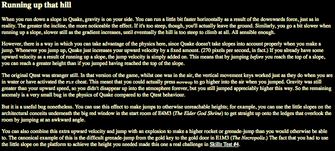 When you run down a slope in Quake, gravity is on your side. You can run a little bit faster horizontally as a result of the downwards force, just as in reality. The greater the incline, the more noticeable the effect. If it’s too steep, though, you’ll actually leave the ground. Similarly, you go a bit slower when running up a slope, slower still as the gradient increases, until eventually the hill is too steep to climb at all. All sensible enough.