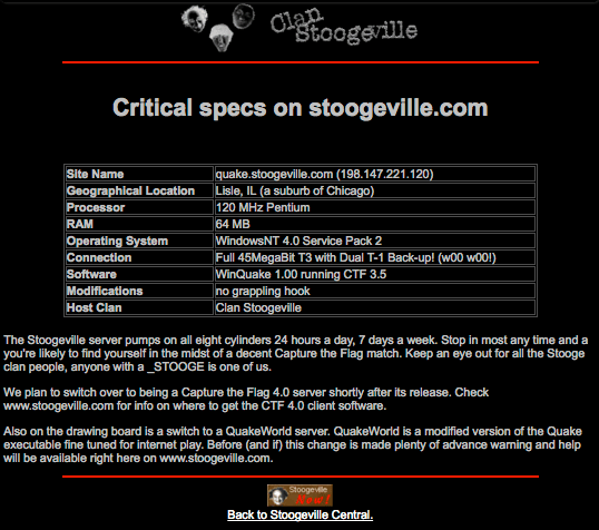 Also on the drawing board is a switch to a QuakeWorld server. QuakeWorld is a modified version of the Quake executable fine tuned for internet play. Before (and if) this change is made plenty of advance warning and help will be available right here on http://www.stoogeville.com.