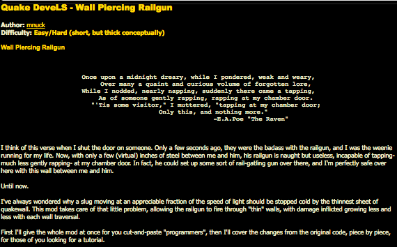 I’ve always wondered why a slug moving at an appreciable fraction of the speed of light should be stopped cold by the thinnest sheet of quakewall. This mod takes care of that little problem, allowing the railgun to fire through “thin” walls, with damage inflicted growing less and less with each wall traversal.