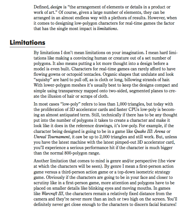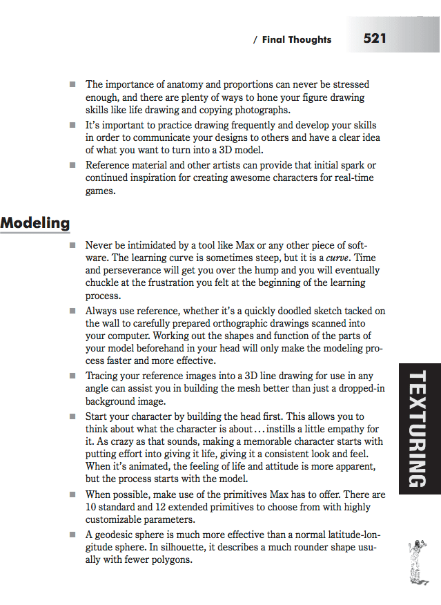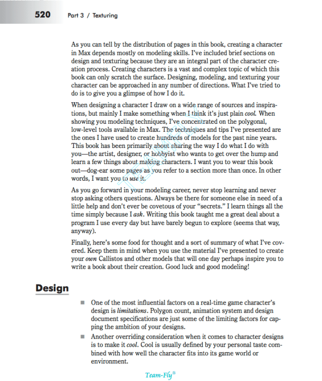 By purchasing this book you’ve decided to see if someone else can help teach you to teach yourself. Specifically you want help in learning how to create great, low-poly characters in Max. I’m betting that someone (me) can. Be forewarned, though, I’m not just adding another didactic, strictly educational, dry technical manual to your collection. I wanted this book to reflect a little more personality. I’ve included occasional anecdotal “authorized digressions” or small tales of life “in the trenches” as a developer. I’ve also included FYIs, For Your Information factoids or observations that pertain to the material being covered. File them away for reference or skip past them—it’s up to you.