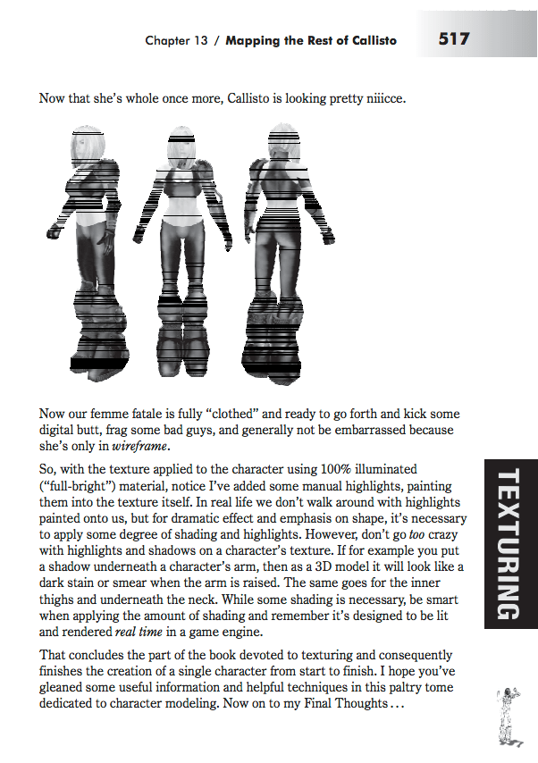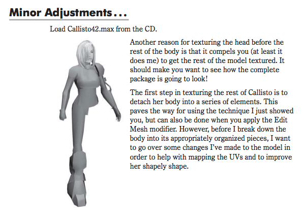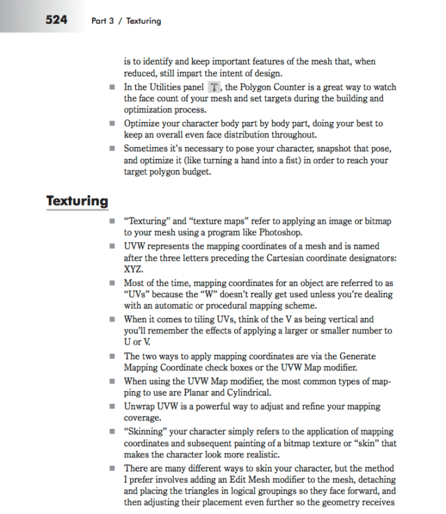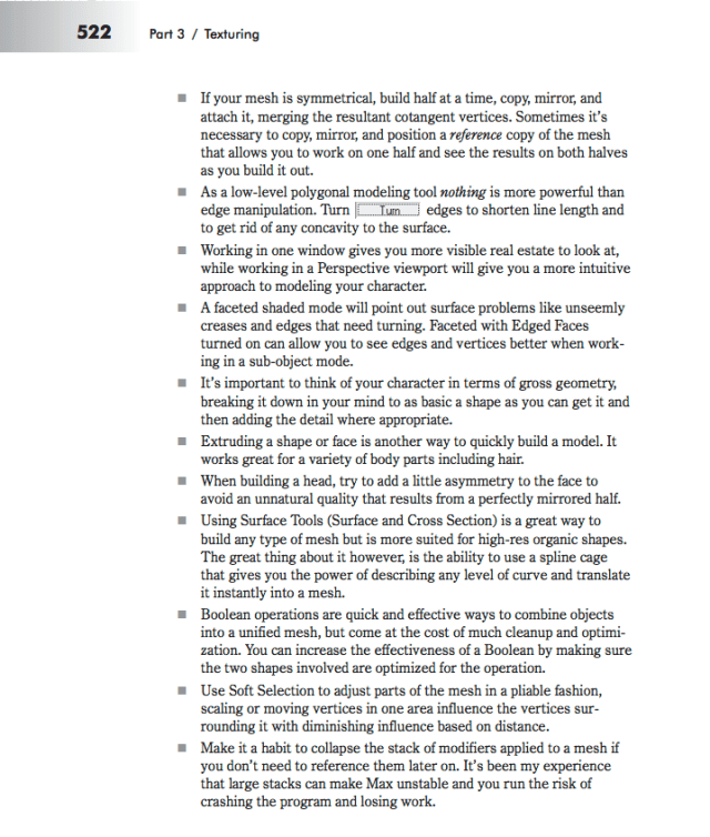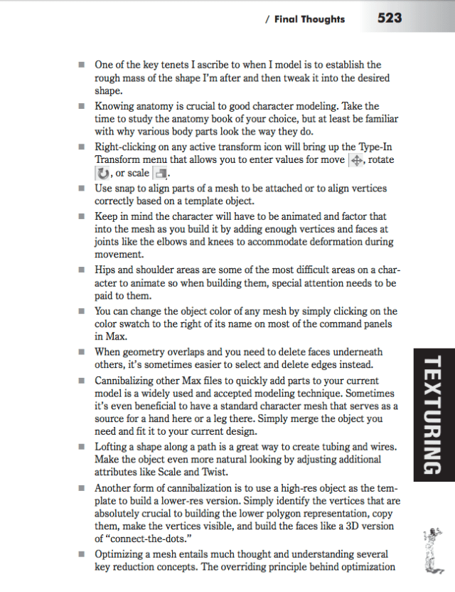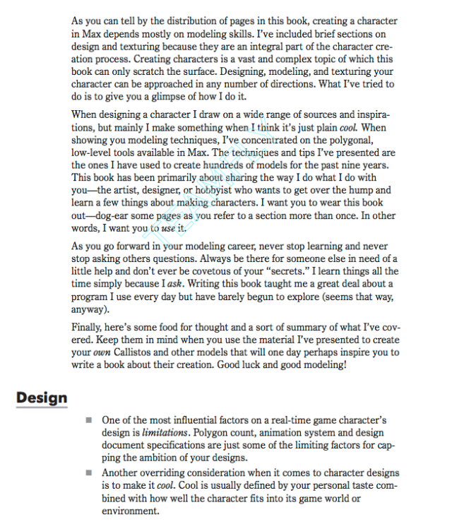 Since I’m an artist I’ve probably included more illustrations than a typical book on Max. This is because I have a pet peeve with some books not having enough illustrations, but it’s also because I wanted to make it readable. That is, you can learn from it even if you don’t have Max running in front of you. It’s instructional and conversational. If you’re tired of huddling in your office poring over the words and images printed here, sit on a park bench out of the office somewhere and read over the material at your leisure. You’ll feed your brain, and remember what sunlight feels like on your skin and what birds sound like when they chirp. As far as building a buxom female character instead of a male or creature character. . . it was just a personal decision. Any and all of the methods I introduce will work on whatever gender or species you prefer.