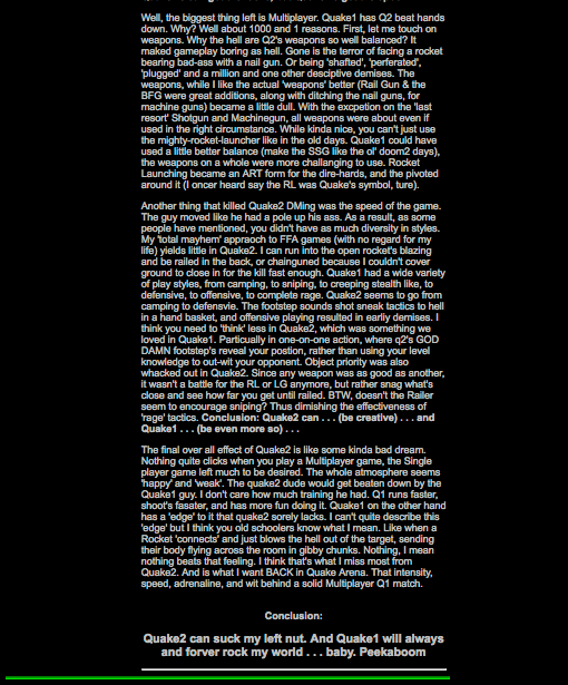 Conclusion:Quake2 can suck my left nut. And Quake1 will always and forver rock my world . . . baby. Peekaboom