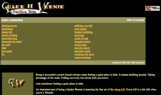 And sometimes finding a quiet place to hide. An important part of being a Quake Weenie is learning the fine art of the cheap kill. Every kill is a fair kill when you’re a Weenie. |