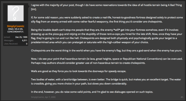 Alot of the best CTF maps in the history of internet gaming, i.e. 2fort4(Quake TF, with several Q2WF/TFC/UT variants), Strongholds (Q2CTF), Broadside (Tribes CTF), Cancer1wf (Q2WF) and many I cannot think to name right at this moment, all share, overall, alot of the same characteristics from map to map.
