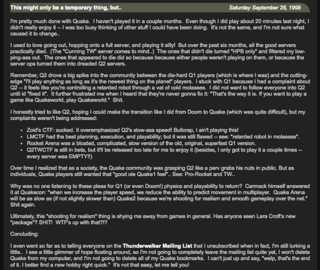 I even went so far as to telling everyone on the Thunderwalker Mailing List that I unsubscribed when in fact, I’m still lurking a little.. I see a little glimmer of hope floating around, so I’m not going to completely leave the mailing list quite yet, I won’t delete Quake from my computer, and I’m not going to delete all of my Quake bookmarks. I can’t just up and say, “welp, that’s the end of it. I better find a new hobby right quick.” It’s not that easy, let me tell you!