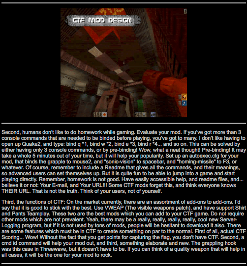 After you’ve gotten the basics, there is actual creation. Creating the mod requires perseverance. For one, never just add things to an existing mod. Sure, you can use a (knock-on-wood) CTF engine, but make (da*ned) sure to overwrite everything. CTF mods are not popular if they just add a bit onto q2ctf for example. You must make totally new level, new models, new art, and last of all, a new storyline. Since there are so many mods, distinguishing yours from many requires having a good storyline, simplicity, and 1 or 2 new things that blow peoples socks away… not 75 that all suck. Quality makes CTF. CTF is phenomenal.