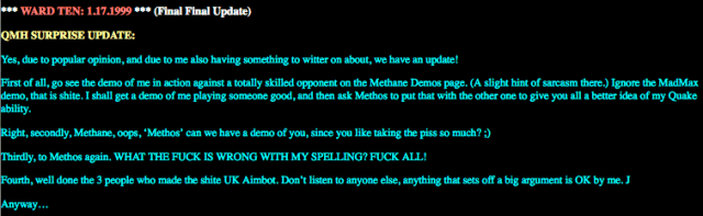 First of all, go see the demo of me in action against a totally skilled opponent on the Methane Demos page. (A slight hint of sarcasm there.) Ignore the MadMax demo, that is shite. I shall get a demo of me playing someone good, and then ask Methos to put that with the other one to give you all a better idea of my Quake ability.
