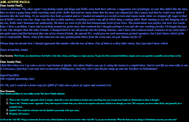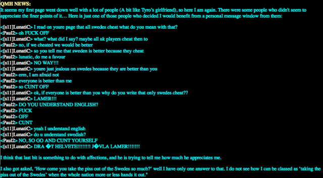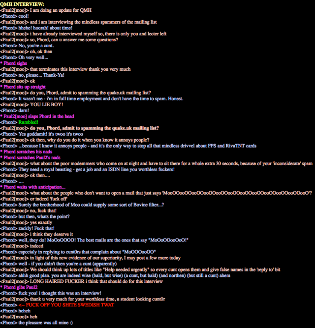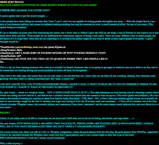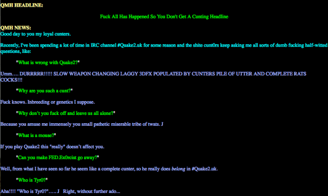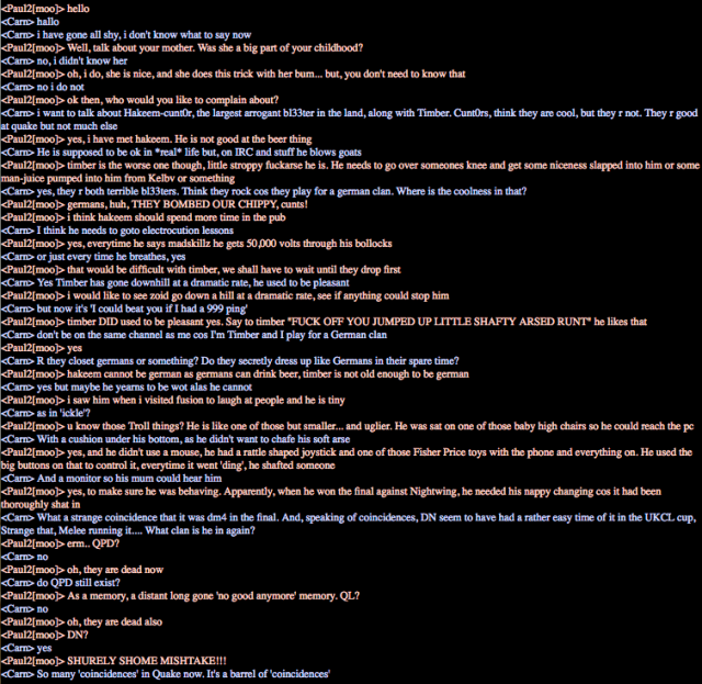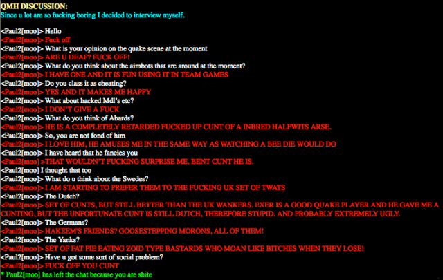 <Paul2[moo]> SET OF CUNTS, BUT STILL BETTER THAN THE UK WANKERS. EXER IS A GOOD QUAKE PLAYER AND HE GAVE ME A CUNTING, BUT THE UNFORTUNATE CUNT IS STILL DUTCH, THEREFORE STUPID. AND PROBABLY EXTREMELY UGLY.