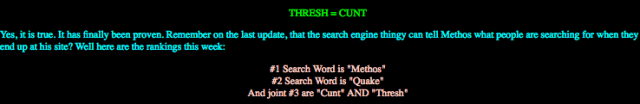 Secondly, since Methos has probably to take the blame for everything I write, I would like to kick off with a quick statement. “THRESH IS A FUCKING SHITE CUNT!” There you are.