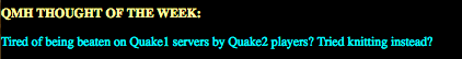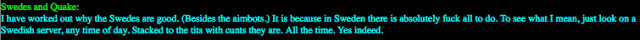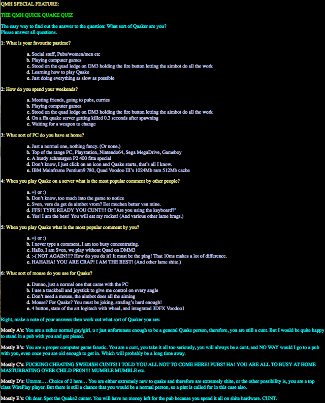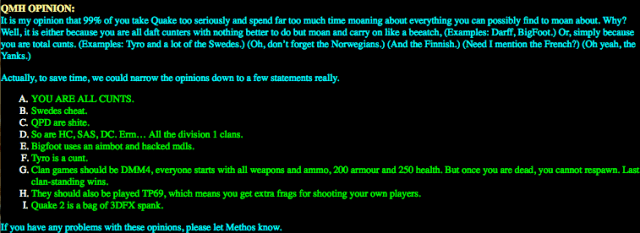 It is my opinion that 99% of you take Quake too seriously and spend far too much time moaning about everything you can possibly find to moan about. Why? Well, it is either because you are all daft cunters with nothing better to do but moan and carry on like a beeatch, (Examples: Darff, BigFoot.) Or, simply because you are total cunts. (Examples: Tyro and a lot of the Swedes.) (Oh, don’t forget the Norwegians.) (And the Finnish.) (Need I mention the French?) (Oh yeah, the Yanks.)
