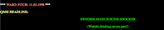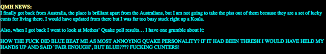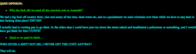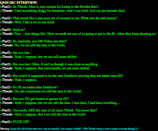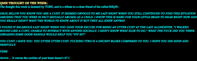 Big thanks to: Rawmeat for the ‘cunt’ training, Ledge for generally being a cunt, Zoid for being so fat it is amusing, Tyro for being simple and generally amusing material, Swedes for being cheating cunts, Americans for having the ‘ultimate wanker’ (Thresh), Methane for doing the HTML on this shitty site, Psyggrl for teaching me some Swedish abuse that has come in useful, all the people who asked me to keep QMH open. It’s tough shit, cos it’s closing, but I think there are a few people who could do something similar. And probably better.