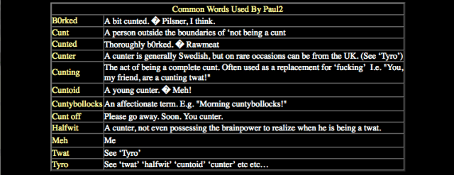 Before I go on I should probably do a little dictionary of words u might see a lot for u people out there who have no cunting idea at all about anything. These are not my words, just words I like to use. Often.
