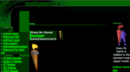 The model was originally the weapon for the pogo rabbit. It was a teensy little thing. I never had any cash for something like 3D Studio Max and Q2Modeller can’t really do joints. So when I found the carrot I thought ‘Well now then, theres a player plug-in waiting to happen’