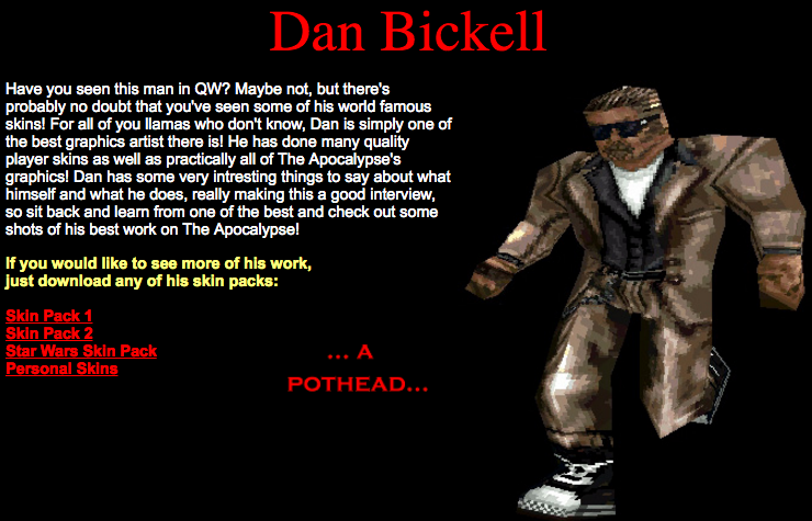 Have you seen this man in QW? Maybe not, but there’s probably no doubt that you’ve seen some of his world famous skins! For all of you llamas who don’t know, Dan is simply one of the best graphics artist there is! He has done many quality player skins as well as practically all of The Apocalypse’s graphics! Dan has some very intresting things to say about what himself and what he does, really making this a good interview, so sit back and learn from one of the best and check out some shots of his best work on The Apocalypse!