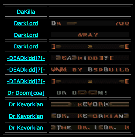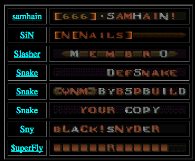 | WYSIWYG QNM’s GUI displays the characters exactly as they appear in Quake. Even the animated name is displayed on a background from the game. There are even sounds that are played to give you the feeling of actually being in a bloddy deathmatch. Easy To Use And Customize QNM provides mouse and keyboard support. And almost every aspect of QNM is customizable, including how the keyboard reacts. You can set your own keys! Other items you can customize are Colors, Cursors, Background for Previewer, Prompts, Sounds, and character sets. Multiple Character Set Support QNM includes over 25 different character sets to choose from. So if you want to see what your name will look like in Hexen2, Quake, or Quake Rally, then choose it. I am always searching the web for new character sets, and when more become available all you have to do is download 1 file. Automatic Animation QNM’s Animation Wizard takes all of the pain out of creating animated names. All you need to do is make 1 name, and the Animation Wizard allows you to choose from over 2 million possible combinations of animation effects. Select the Style, Colors, Case, and Build it! QNM does the rest. Unique Export Bitmap This is a cool addition I added for making web art. The Export Bitmap Wizards allow you to make bitmaps of your name, animation, and messages. Convert them to gif or some other html supported graphic and you get web art. Check out some examples of Animated Gifs in the QNM Gallery, or take a peak at the QNM clans who used QNM to decorate their clan pages. Very cool!Back to Top |