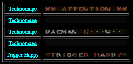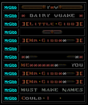| WYSIWYG QNM’s GUI displays the characters exactly as they appear in Quake. Even the animated name is displayed on a background from the game. There are even sounds that are played to give you the feeling of actually being in a bloddy deathmatch. Easy To Use And Customize QNM provides mouse and keyboard support. And almost every aspect of QNM is customizable, including how the keyboard reacts. You can set your own keys! Other items you can customize are Colors, Cursors, Background for Previewer, Prompts, Sounds, and character sets. Multiple Character Set Support QNM includes over 25 different character sets to choose from. So if you want to see what your name will look like in Hexen2, Quake, or Quake Rally, then choose it. I am always searching the web for new character sets, and when more become available all you have to do is download 1 file. Automatic Animation QNM’s Animation Wizard takes all of the pain out of creating animated names. All you need to do is make 1 name, and the Animation Wizard allows you to choose from over 2 million possible combinations of animation effects. Select the Style, Colors, Case, and Build it! QNM does the rest. Unique Export Bitmap This is a cool addition I added for making web art. The Export Bitmap Wizards allow you to make bitmaps of your name, animation, and messages. Convert them to gif or some other html supported graphic and you get web art. Check out some examples of Animated Gifs in the QNM Gallery, or take a peak at the QNM clans who used QNM to decorate their clan pages. Very cool!Back to Top |