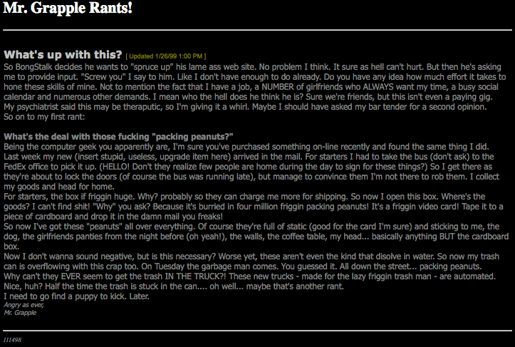So BongStalk decides he wants to “spruce up” his lame ass web site. No problem I think. It sure as hell can’t hurt. But then he’s asking me to provide input. “Screw you” I say to him. Like I don’t have enough to do already. Do you have any idea how much effort it takes to hone these skills of mine. Not to mention the fact that I have a job, a NUMBER of girlfriends who ALWAYS want my time, a busy social calendar and numerous other demands. I mean who the hell does he think he is? Sure we’re friends, but this isn’t even a paying gig.