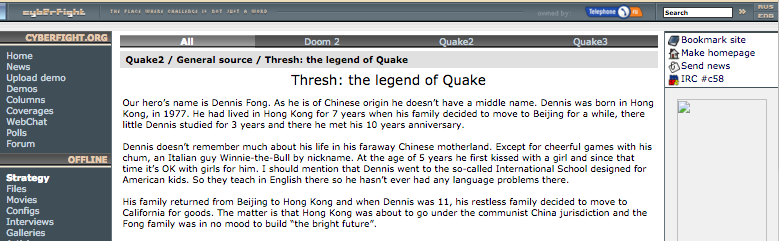 Thresh: the legend of QuakeOur hero’s name is Dennis Fong. As he is of Chinese origin he doesn’t have a middle name. Dennis was born in Hong Kong, in 1977. He had lived in Hong Kong for 7 years when his family decided to move to Beijing for a while, there little Dennis studied for 3 years and there he met his 10 years anniversary. Dennis doesn’t remember much about his life in his faraway Chinese motherland. Except for cheerful games with his chum, an Italian guy Winnie-the-Bull by nickname. At the age of 5 years he first kissed with a girl and since that time it’s OK with girls for him. I should mention that Dennis went to the so-called International School designed for American kids. So they teach in English there so he hasn’t ever had any language problems there. His family returned from Beijing to Hong Kong and when Dennis was 11, his restless family decided to move to California for goods. The matter is that Hong Kong was about to go under the communist China jurisdiction and the Fong family was in no mood to build “the bright future”. They fulfilled their decision and started a new life. The future virtual combat champion started the Cupert high school, California, immediately. He had all As, making his parents happy with his progress. Unlike his brothers, elder Leila and younger Bryanthan, Dennis was by nature extremely fond of real sport. While his brothers were goggling at computers all days long, Dennis was eagerly playing football. He was taking up sports seriously, especially tennis and volleyball. Besides at school he organized a roller hockey club. Getting acquainted with the GameOnce passing his brother Bry’s room, Dennis heard a wild screaming behind the door, stunning explosions and random shooting. Got interested he entered the room and asked about what was going on. It turned out that his brother was having fun playing the game with the heavy name DOOM. Dennis drove his brother away of the keyboard and driven by the sport interest tried to play himself. As a result he was smashed up. Dennis surprize was beyond the boundaries! He started questioning his brother about the way his opponent was programmed as he had unusual skills and was completely unpredictable. And it turned out at once that he had been playing not with a computer but with his brother pal at San Jose. An opportunity to play on computer with another man stroke Dennis completely. To play with a man was just the thing he got used to. But to play with a man on a computer – it was something new! It turned out then that such games were none the less interesting to him as the real sport. Since that time Dennis took to such stuff completely. Playing many and often, having an excellent reaction and keen mind, he advanced rapidly and soon became a cool elite fighter. It’s worth saying that at that time there was no Internet in its present sense, even in America. Thus people were keeping in touch by means of BBS, in chat-rooms they made agreements about future combats and having dialed-up, started combats. And then the question of telephone bills payment was looming severely. But the skills of the future champion were of great help even there! The matter is that according to the unwritten rules it is a challenger who pays for everything. So living at his own money Dennis didn’t waste them and his biggest payment bill was just 150 bucks. At the same time other less talented fighters were draining up to several hundred of greenbacks. In order to avoid the payment folks were constantly moving around the country as that was not a big deal in America. Besides DOOM Dennis was keen on MUD (if you don’t know – it stands for Multi-User Dungeon – text on-line games) and on WarCraft II, the Blizzard masterpiece. He got his hand in at it and won some serious victories on different tournaments. Where the Thresh startedPlaying MUD Dennis took the nickname Threshold and added the title “of Pain”, it made Threshold of Pain. It was sound and smashing. But in DOOM you can’t use name longer than 8 symbols. So Dennis decided to shorten his colorful title and become just Threshol. Do you understand that it sounded a bit dopey? Just like asshole, and it’s not the way that a expert like him could be addressed. So he shortened his nick up to simple Thresh. Though he had a profound knowledge of English, Thresh took the time and trouble and consulted the dictionary. And then he found out that his new nick means “to strike repeatedly”. Thus “Threshold ” invisibly, smoothly and steadily became “thresh”. Dennis was very much content about his new nick. CompetitionMeanwhile the computer games were developing rapidly. Multiplayers were constantly improving and greater and greater number of people wanted to take part in the competitions and tournaments to show everybody who is the real big guy. Competitions became quite a regular thing. Of course, shooters and real-time strategies were dominating. The first really great national/international tournament was The Dwango league, hosted by the Dwango firm. It’s evident that they were playing DOOMII – the coolest at the moment. Thresh was the head of the San Jose team. Except for him there was Usurper, Bry, Slayer and Major. The tournament was on 1-on-1 system, it means that only duels were played and Thresh was as good at them as nobody else. His team reached the final easily where they smashed up the Washington team and beat out them all. Deathmatch 1995Deathmatch ’95 was one of the first (to be precisely it was really the first) international PC games tournaments, and for sure it was the largest one at the moment. It was timed to the broad celebration of the Microsoft Judgement Day and it was as the promotion for the Microsoft games. It was not quite clear what Microsoft were heading for as they were playing games of different, more talented game companies: DOOM, DOOM II and Heretic. Combat schedule was also rather strange, so at the same time t