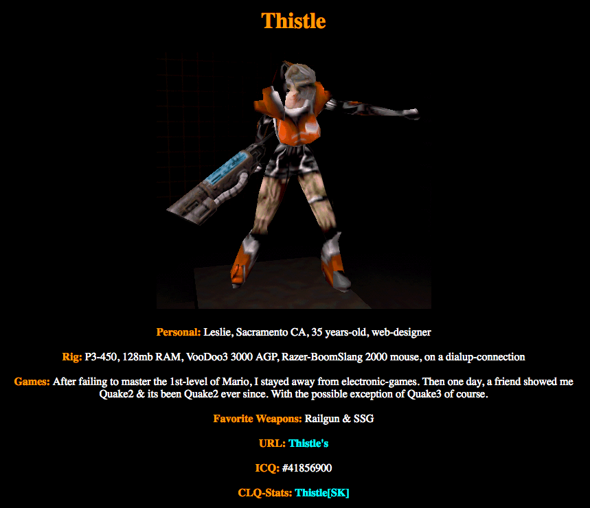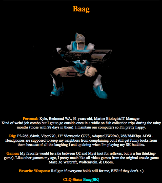 Favorite Weapons: Q2: RL & Chaingun. I suck at rail. My favorites for Q3 are the BFG, Plasma-gun, & RL.