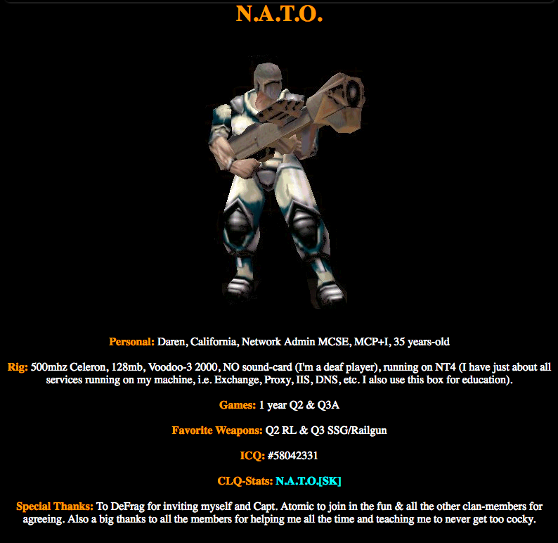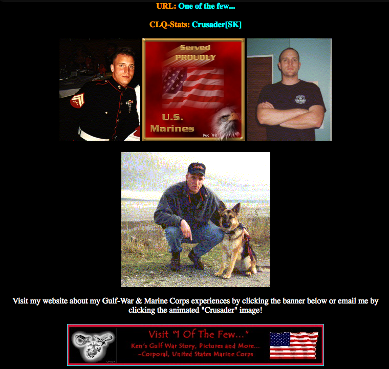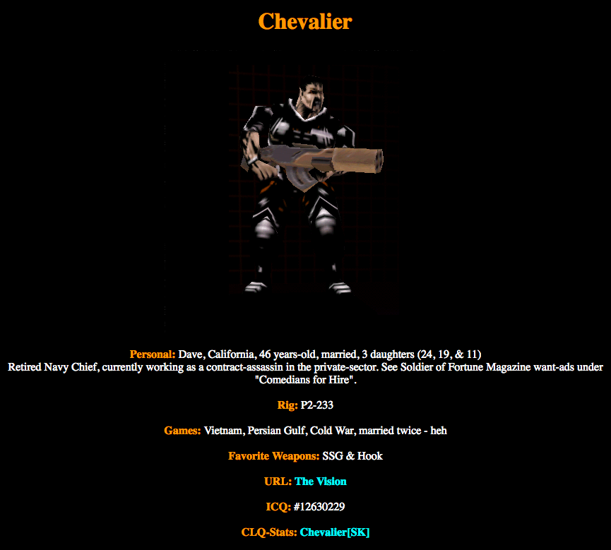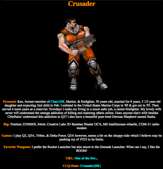 Personal: Ken, former-member of Clan-GM, Marine, & firefighter, 30 years-old, married for 8 years, 3 1/2 year-old daughter and expecting 2nd child in Feb. I enlisted in the United States Marine Corps in ’89 & got out in ’93. Then served 4 more years as a reservist. Nowdays I make my living in a much safer job, a career-firefighter. My lovely wife never will understand the strange addiction of killing and maiming others online. Does anyone else’s wife besides Chieftains’ understand this addiction to Q2? I also have a beautiful pure-bred German Shepherd named Sasha.