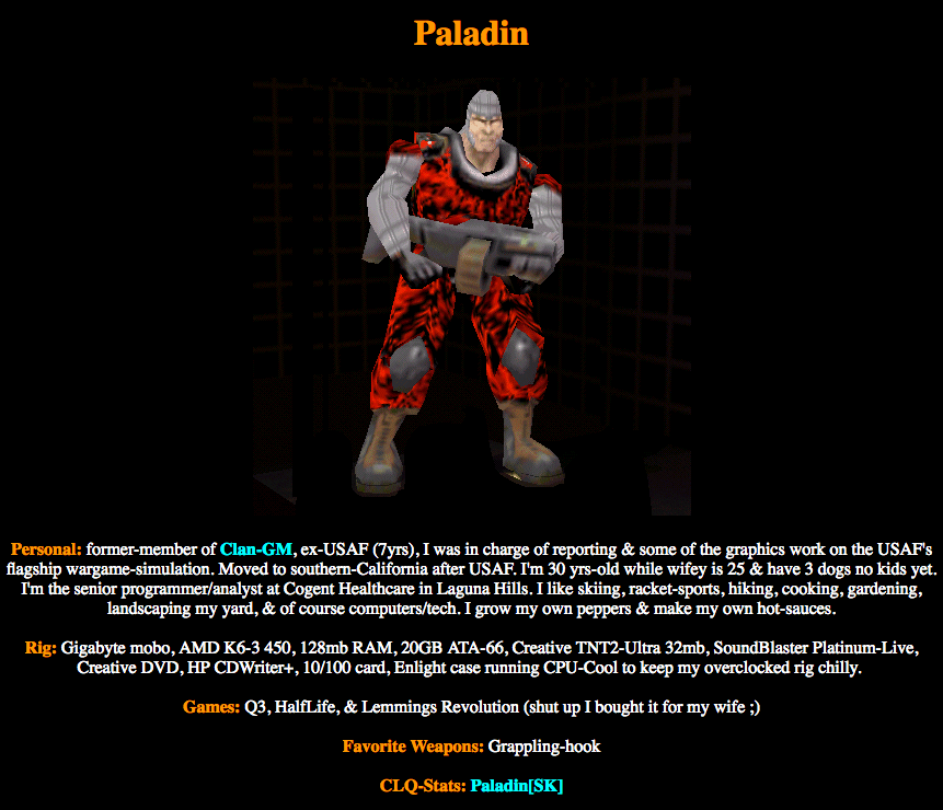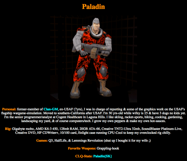 Personal: former-member of Clan-GM, ex-USAF (7yrs), I was in charge of reporting & some of the graphics work on the USAF’s flagship wargame-simulation. Moved to southern-California after USAF. I’m 30 yrs-old while wifey is 25 & have 3 dogs no kids yet. I’m the senior programmer/analyst at Cogent Healthcare in Laguna Hills. I like skiing, racket-sports, hiking, cooking, gardening, landscaping my yard, & of course computers/tech. I grow my own peppers & make my own hot-sauces.