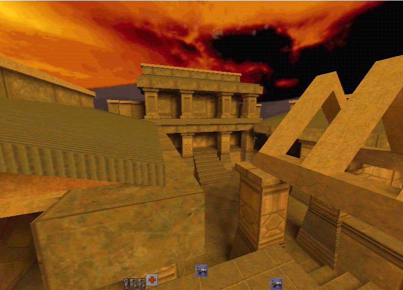 Another difference RA2 has over Deathmatch is that splash damage from your own rockets doesn’t affect your health AKA a rocketjump. This is truly ingenious. For example you are strafing around in an open arena and your opponent goes to switch a weapon which means a second of freedom in which you aim your r/l at the ground and if he is close enough will splatter him into a fine mist. You safely land from your flight victorious and looking for your next kill.
