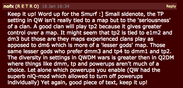 Anyway as I mentioned Q1 players are used to tp 2, even in the countries whose Q2 scenes use tp 4. As far as I know, in the Q1 scene the tp setting is much less a matter of what country you’re in than of what map you’re in. In big maps like q1dm3 and e1m2, tp 2 is always used, while in a small hectic map like q1dm6, many clans (regardless of where they are from) prefer to play with tp 4. But in almost all serious competitions only dm3 and e1m2 are played, so tp 2 is the de facto standard in Quake 1.