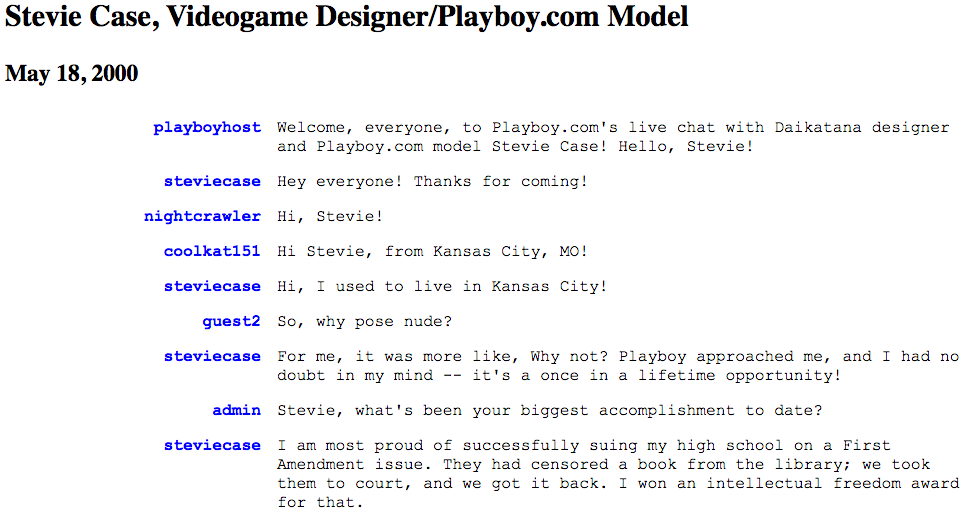| playboyhost | Welcome, everyone, to Playboy.com’s live chat with Daikatana designer and Playboy.com model Stevie Case! Hello, Stevie! |