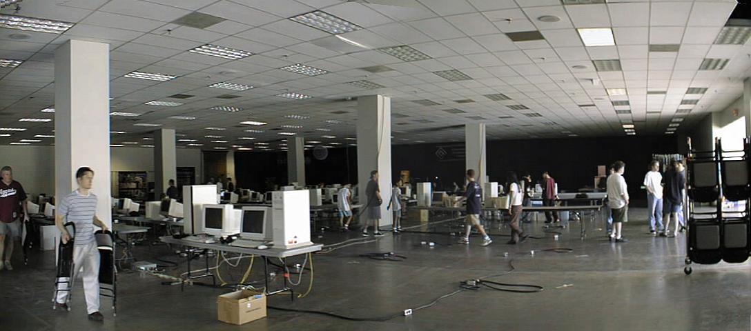 The event is running two hours behind schedule. About three-fourths of the tournament computers are set up, and the Intergraph chairs are just now being placed.