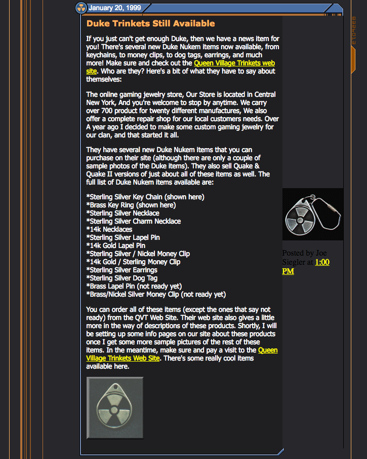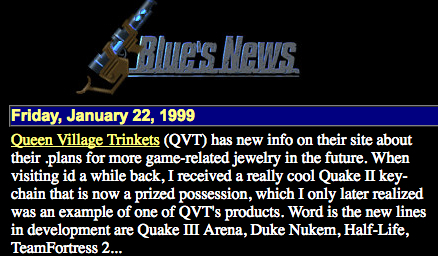 Queen Village Trinkets (QVT) has new info on their site about their .plans for more game-related jewelry in the future. When visiting id a while back, I received a really cool Quake II key-chain that is now a prized possession, which I only later realized was an example of one of QVT’s products. Word is the new lines in development are Quake III Arena, Duke Nukem, Half-Life, TeamFortress 2…