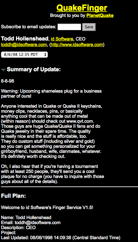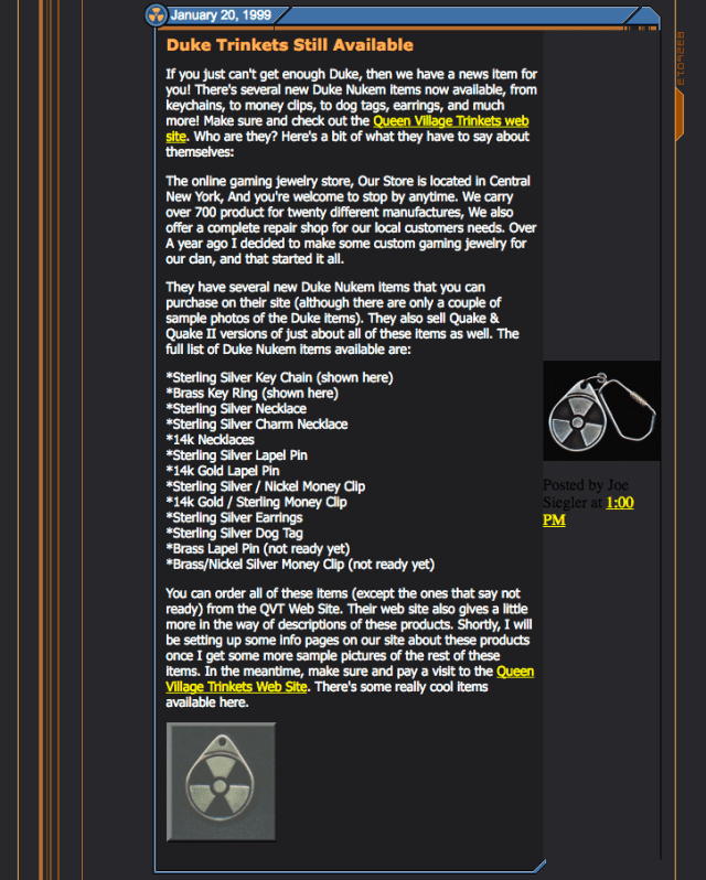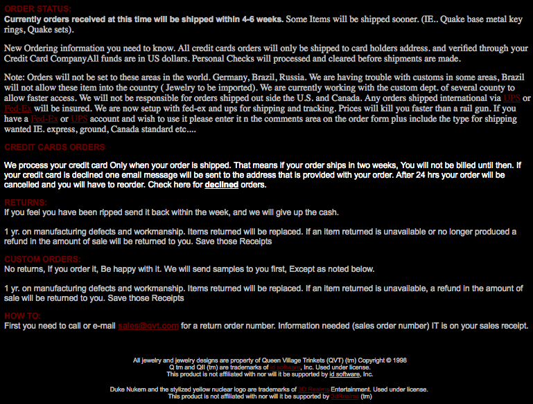 Carmack wrote: “Those guys are huge Quake/Quake II fans and do Quake jewelry in their spare time. The quality is really nice and the stuff is affordable, too. They do custom stuff (including silver and gold) so you can get something personalized for your girl/boyfriend, husband, wife, clanmates, whatever. It’s definitely worth checking out.