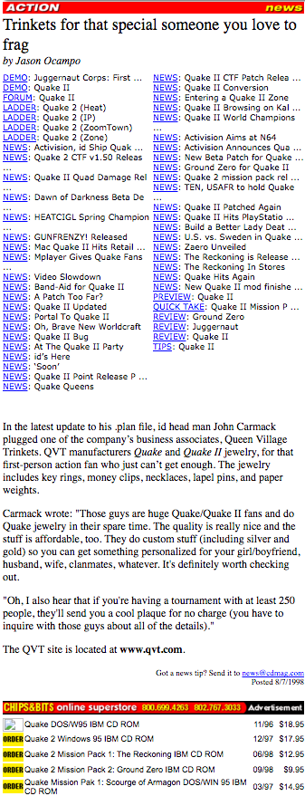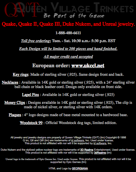 In the latest update to his .plan file, id head man John Carmack plugged one of the company’s business associates, Queen Village Trinkets. QVT manufacturers Quake and Quake II jewelry, for that first-person action fan who just can’t get enough. The jewelry includes key rings, money clips, necklaces, lapel pins, and paper weights.