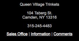 You can order all of these items (except the ones that say not ready) from the QVT Web Site. Their web site also gives a little more in the way of descriptions of these products. Shortly, I will be setting up some info pages on our site about these products once I get some more sample pictures of the rest of these items. In the meantime, make sure and pay a visit to the Queen Village Trinkets Web Site. There’s some really cool items available here.