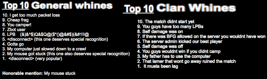 Ok, so Im guilty of this. Frag me. Ever experience a LPB who starts whining about his lag with a 30 ping compared to his opponents 300 ping? As quoted from X-Axle, “So, LPB, when you get whupped by one of my brothers, don’t complain, give him his props, or at least keep your mouth shut.“